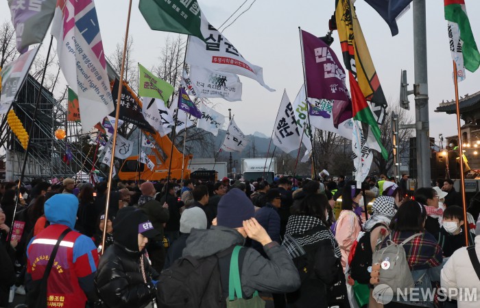 [서울=뉴스핌] 양윤모 기자 = 검찰 비상계엄 특별수사본부(본부장 박세현 서울고검장)가 8일 오후 윤 대통령에 대한 석방 지휘서를 서울구치소에 송부한 가운데, 윤석열 즉각퇴진·사회대개혁 비상행동이 서울 광화문 동십자각 근처에서 윤석열 탄핵을 위한 '14차 범시민대행진'을 개최하며 검찰의 윤석열 석방을 규탄하는 집회를 열고 있다. 2025.03.08 yym58@newspim.com