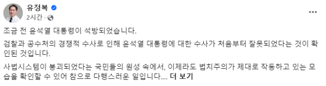 8일, 유정복 시장은 자신의 사회관계망서비스(SNS)를 통해 윤석열 대통령의 석방 소식을 전하며, "조금 전 윤석열 대통령이 석방되었다"며 "검찰과 공수처의 경쟁적 수사로 인해 처음부터 잘못된 수사였다는 것이 확인된 것"이라고 강조했다.