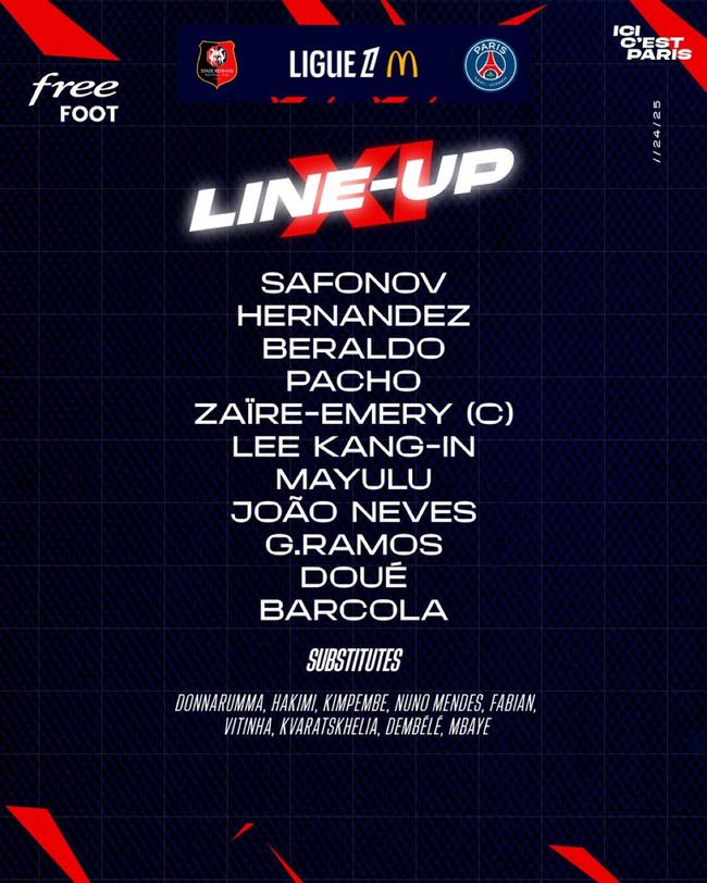 경기를 앞두고 PSG가 선발 라인업을 공개했다. 사포노프, 자이르-에메리, 베랄두, 파초, 에르난데스, 마율루, 네베스, 이강인, 두에, 하무스, 바르콜라가 선발로 나선다.