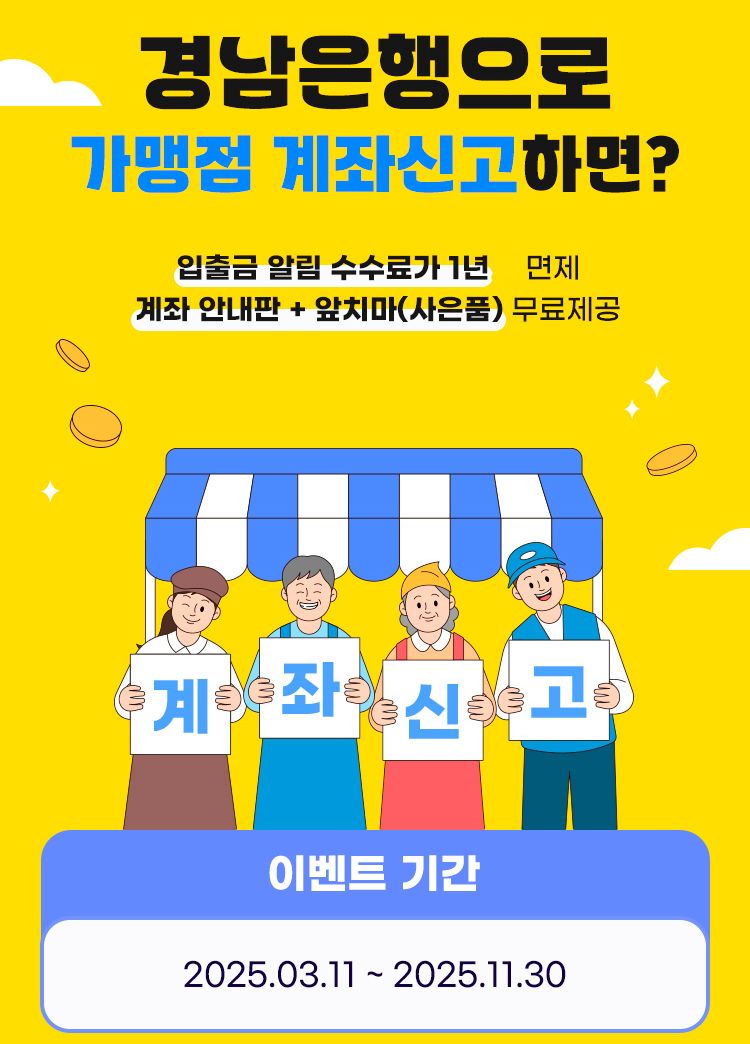 2025년 2월 기준 BNK경남은행 계좌로 BC가맹점 대금 입금 실적이 없는 고객이 이벤트 기간에 BNK경남은행 가맹점 계좌로 대금 입금 실적을 쌓고 입출금 알림 서비스를 신청하면 서비스 수수료를 면제해 준다.