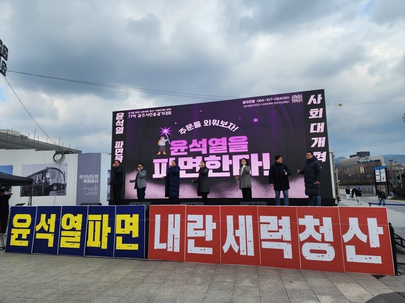 8일 광주광역시 동구 5·18민주광장에서 윤석열정권즉각퇴진·사회대개혁 광주비상행동이 주최한 윤석열 대통령 파면 촉구 시민총궐기대회가 열리고 있다. 광주비상행동 제공 |