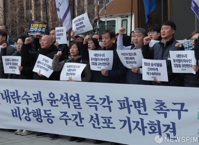 [서울=뉴스핌] 이길동기자= 윤석열즉각퇴진·사회대개혁 비상행동 관계자들이 9일 서울 종로구 경복궁 인근 서십자각 앞에서 ‘윤석열 파면 촉구 비상행동 주간’ 선포 긴급 기자회견'하고 있다. 2025.03.09. gdlee@newspim.com
