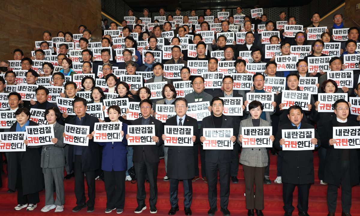 이재명 더불어민주당 대표와 박찬대 원내대표를 비롯한 의원들이 9일 오전 서울 여의도 국회에서 비상의원총회를 마치고 가진 규탄대회에서 윤석열 대통령의 구속 취소 후 즉시항고를 포기한 심우정 검찰총장의 사퇴를 촉구하고 있다. 뉴스1 |