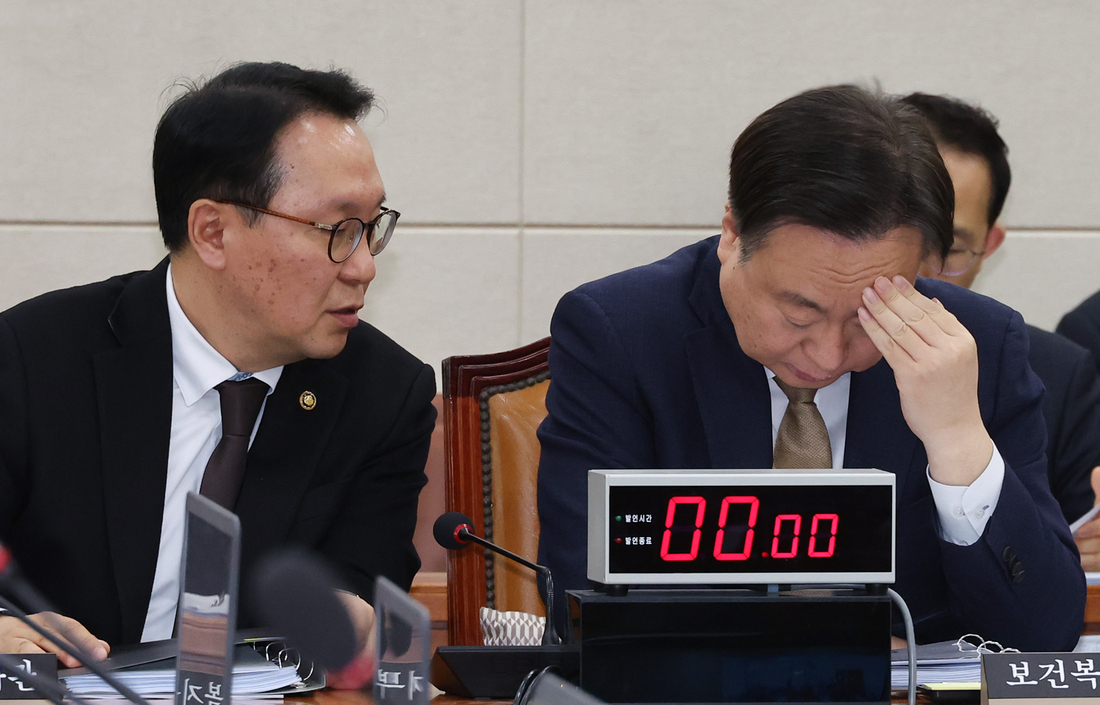 지난 2월 21일 서울 여의도 국회에서 열린 보건복지위원회 전체회의에서 조규홍 보건복지부 장관(오른쪽)과 박민수 제2차관이 대화하고 있다. 연합뉴스 |