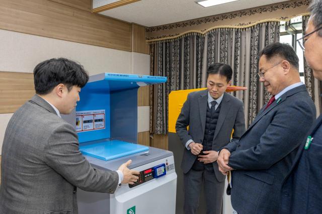 김재욱 칠곡군수가 공동주택 음식물쓰레기 RFID기반 종량기 시연회에서 종량기 작동을 살펴보고 있다. [사진=칠곡군] |