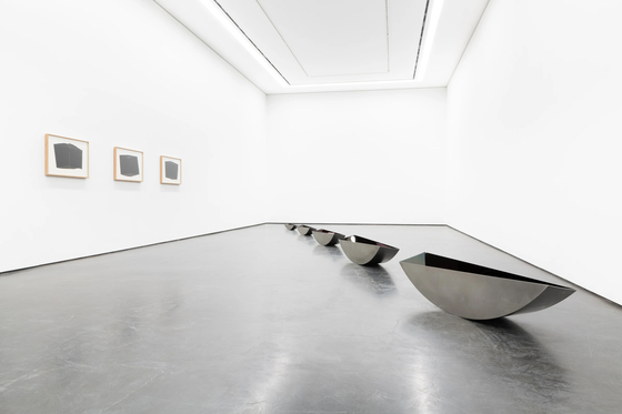 바닥에 설치된 5개 보트 모양의 2004년 작 ‘빈 공간’은 멀리서 볼 때와 가까이 갔을 때 각 입체가 전하는 공간감이 크게 달라진다. 바깥 표면은 스테인리스 스틸이지만, 안쪽 표면은 빛을 모두 흡수하는 블랙 미러로 마감돼 깊이를 알 수 없는 우물을 들여다보듯 아득한 느낌을 준다. 전시장 벽에는 종이 접듯 철판을 접은 조각들이 ‘그림’처럼 걸렸다. 1997년 파리 퐁피두 스튜디오에서 작업하던 그는 작가 노트에 “요즘 나는 물감도 접고, 종이도 접고, 철판도 접는다. 그리고 공간을 만든다. 마음도 한쯤 접어놓고 텅 비어진 기분”이라고 썼다.