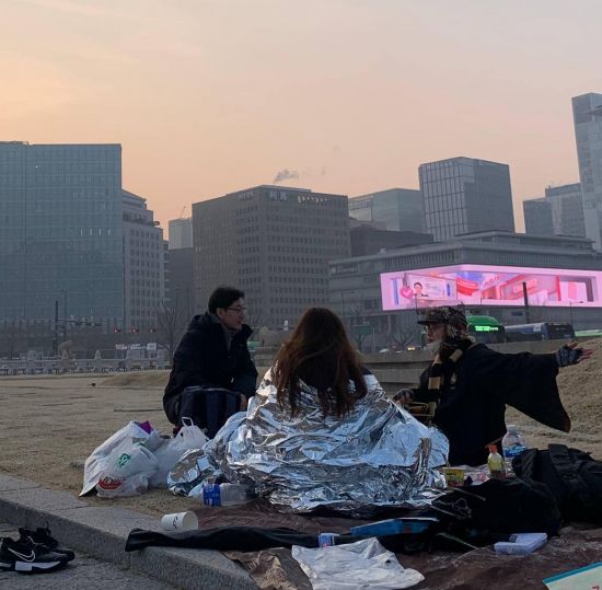 그는 "광화문 주변에는 적지 않은 시민들께서도 밤샘 농성을 하고 계신다"며 "젊은 친구들부터 일흔이 넘은 어르신까지 다양하다. 얇은 은박지 하나로 몸을 감싼 채 아직은 차가운 밤공기를 견뎌내는, 대한민국 민주주의 지킴이 '키세스' 군단"이라고 소개했다.