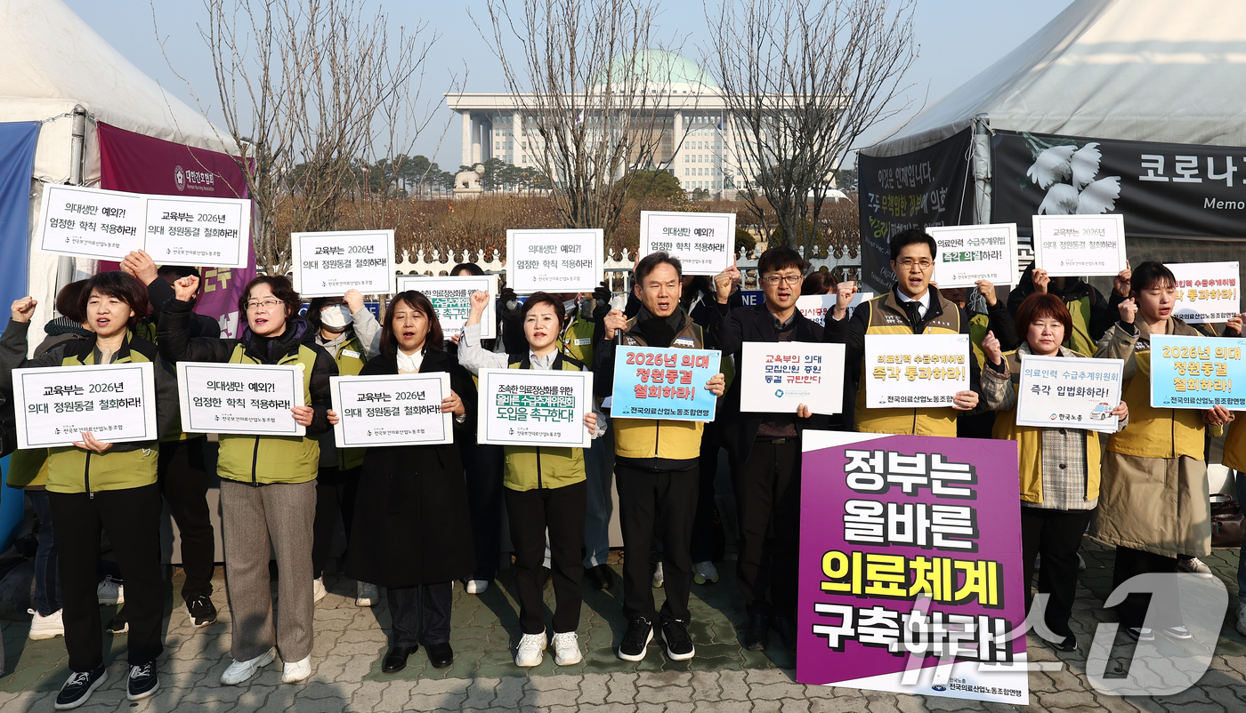 (서울=뉴스1) 김민지 기자 = 전국보건의료산업노조 관계자들이 10일 오전 서울 여의도 국회 앞에서 열린 국민중심 의료개혁 연대회의 긴급 공동기자회견에서 교육부 2026년 의대정원 동결 철회와 의료인력 수급추계위법 즉각 통과를 촉구하고 있다. 2025.3.10/뉴스1