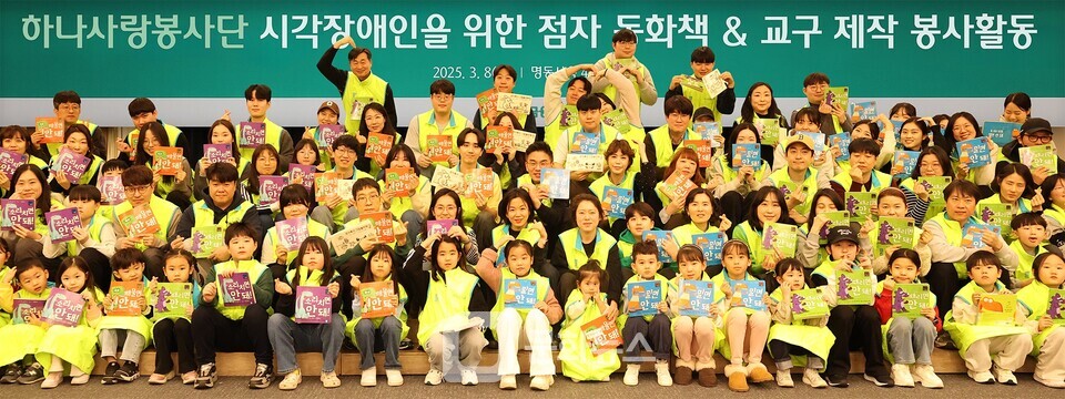 하나금융그룹은 지난 8일 시각장애인의 점자 문해율 향상 및 읽을 권리 보장을 위해 ‘점자 라벨 동화책 제작’ 봉사활동을 실시했다고 밝혔다. 이날 봉사활동에 참석한 하나금융그룹 임직원 및 가족들이 기념촬영을 하고 있다. / 사진제공=하나금융그룹 |