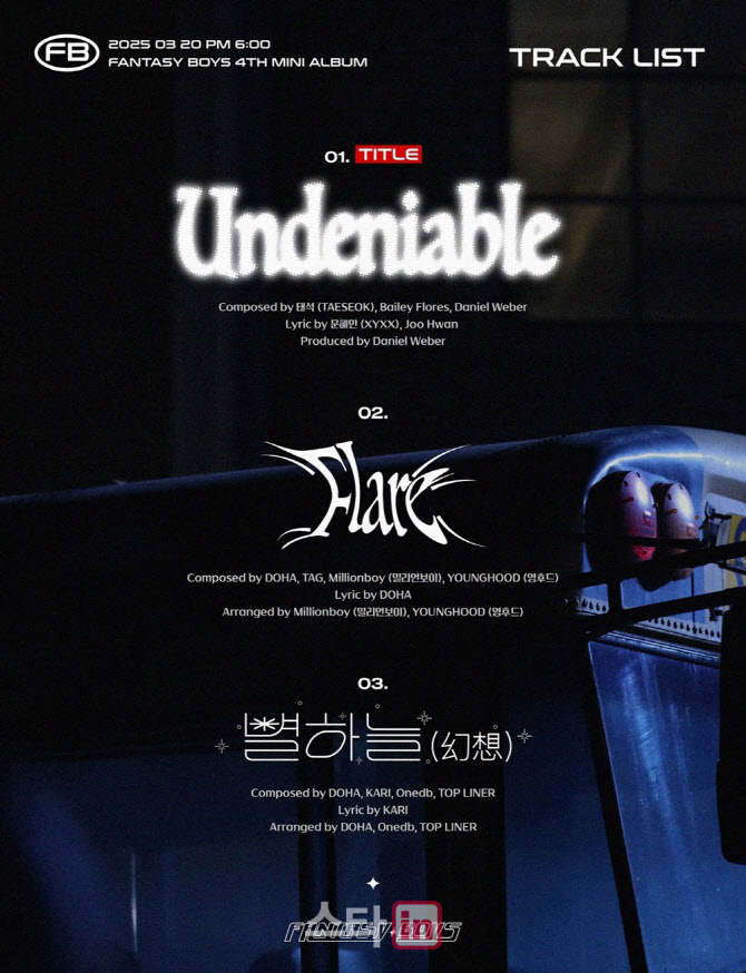 10일 판타지 보이즈의 공식 사회관계망서비스(SNS)에 게재된 미니 4집 ‘언디나이어블’(UNDENIABLE) 트랙리스트에 따르면 새 앨범에는 동명의 타이틀곡 ‘언디나이어블’을 비롯해 ‘플레어’(Flare), ‘별하늘’(幻想) 총 세 곡이 수록된다.