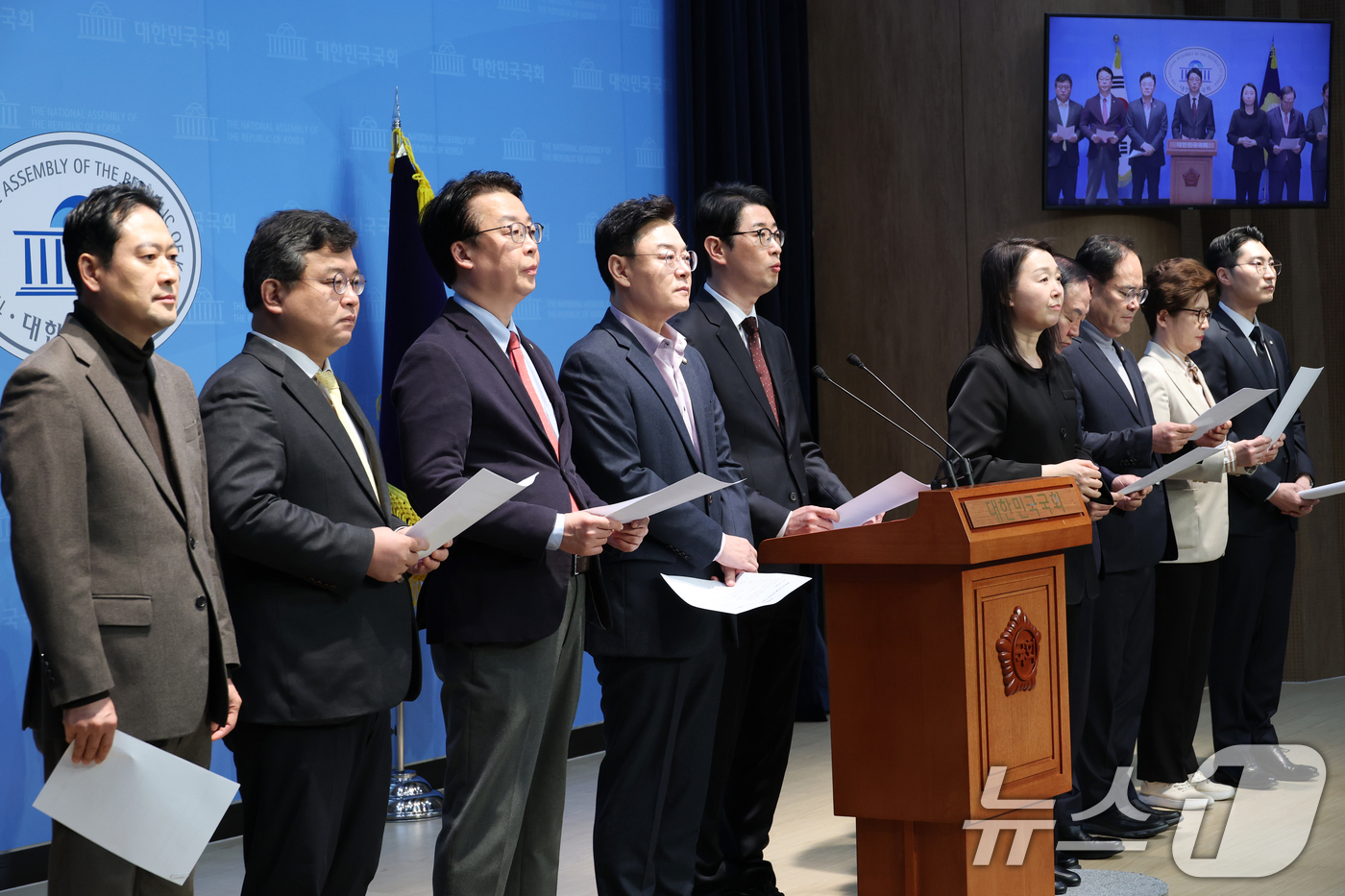 (서울=뉴스1) 이광호 기자 = 국민의힘 주진우 법률자문위원장을 비롯한 내람혐의 국정조사특별위원회 위원들이 10일 오전 서울 여의도 국회 소통관에서 윤석열 대통령 불법체포·감금 등 혐의 오동운 고위공직자법죄수사처장 고발 기자회견을 하고 있다. 2025.3.10/뉴스1
