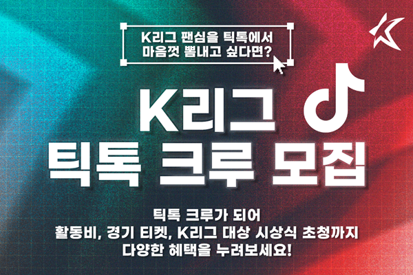 [스포츠투데이 이상필 기자] 한국프로축구연맹(총재 권오갑, 이하 '연맹')이 글로벌 숏폼 동영상 플랫폼 틱톡(Tiktok)과 손잡고 'K리그 틱톡 크루'를 모집한다.