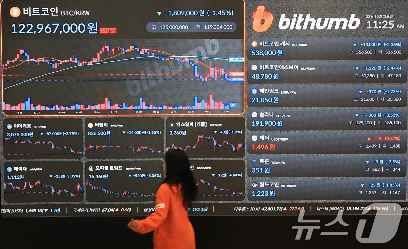 (서울=뉴스1) 박정호 기자 = 10일 서울 서초구 빗썸라운지 전광판에 비트코인 등 가상자산 시세가 표시되고 있다. 글로벌 '무역 갈등' 심화에 경제적 불확실성이 커지며 위험자산에 대한 투자 심리가 얼어붙으며 비트코인 가격이 7만5000달러까지 떨어질 수 있다는 전망이 나오고 있다. 2025.3.10/뉴스1