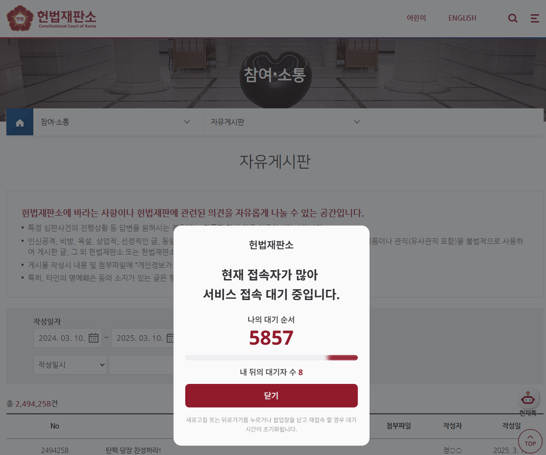 10일 헌재 홈페이지 자유게시판은 글을 남기려는 접속자들이 폭주했다. 글을 올리기 위해 ‘등록’ 버튼을 누르면 이날 오후 2시 기준으로 5800여명이 대기 중이라는 안내가 나왔다. 전날 오후 8시쯤 대기 순서는 1700번이었다.
