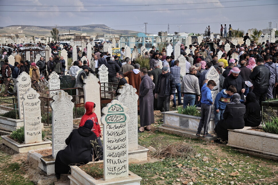 지난 8일 시리아 정부군이 옛 아사드 정권 잔당들과 충돌하며 서부 해안 지역에서 1300여명이 희생됐다. 시리아 서부 하마 지역의 공동묘지에서 가족을 잃은 시리아인들이 장례식에 참석해있다. EPA 연합뉴스 |