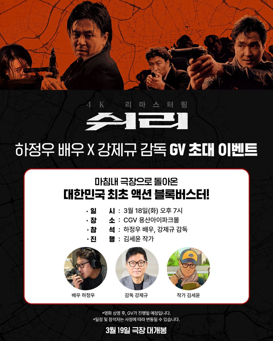 충무로 대표 배우들의 풋풋한 시절과 눈부신 시너지를 확인할 수 있는 영화 '쉬리'가 4K 리마스터링 재개봉을 앞두고 GV를 개최해 이목을 집중시킨다. 김세윤 작가가 모더레이터로 참여하는 '쉬리' GV는 3월 18일 오후 7시 CGV 용산아이파크몰에서 진행되며, '쉬리'로 한국형 블록버스터의 장을 연 강제규 감독과 함께 '신과함께'부터 '백두산', '암살' 등으로 관객들에게 끊임없는 사랑을 받는 배우이자 감독으로도 활발한 활동을 이어가는 하정우가 참여해 풍성한 이야기를 전할 예정이다.