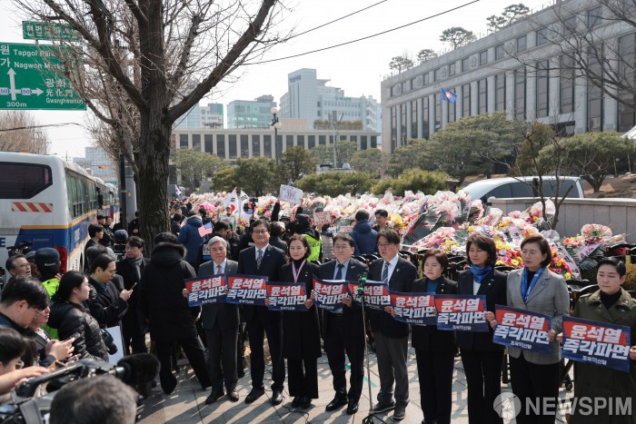 [서울=뉴스핌] 이길동 기자= 조국혁신당 황운하 원내대표를 비롯한 지도부가 10일 오후 서울 종로구 헌법재판소 앞에서 기자회견을 열고 조속한 탄핵 심판 선고를 촉구하고 있다. 2025.0310.gdlee@newspim.com