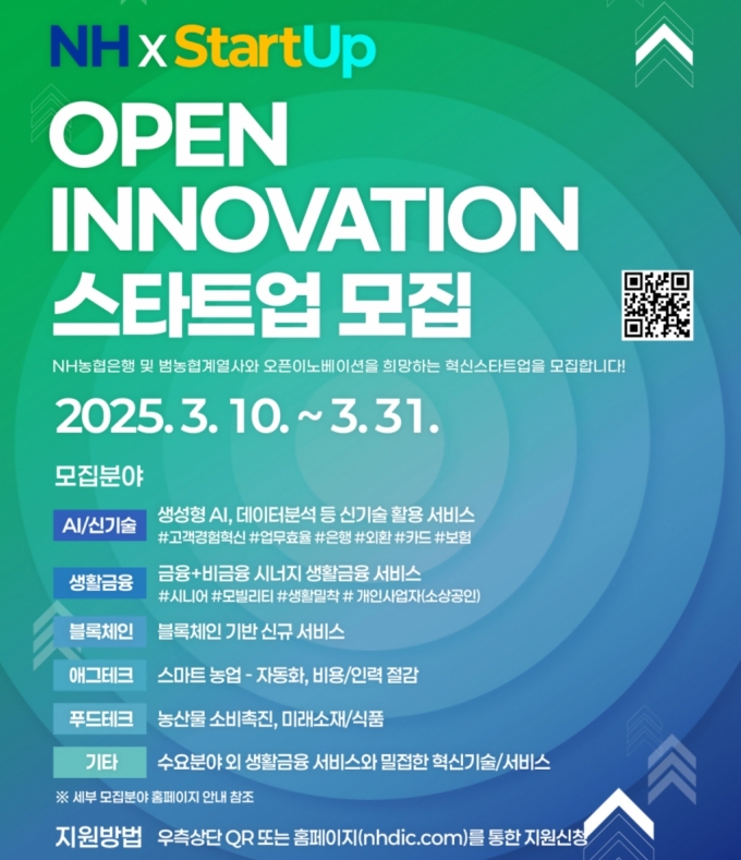 모집분야는 △AI(인공지능)·신기술(생성형 AI, 데이터 분석 등 신기술 활용 서비스) △생활금융(금융+비금융 시너지 생활금융 서비스) △블록체인(블록체인 기반 신규 서비스) △애그·푸드테크(스마트농업, 농산물소비촉진) 등 시너지가 기대되는 다양한 분야에서 모집한다.
