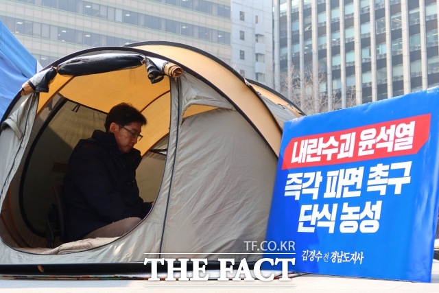 1인용 텐트에 의지한 채 농성 이틀째에 접어든 김 전 지사는 다가오는 윤 대통령에 대한 헌법재판소 탄핵 심판에도 촉각을 곤두세웁니다.
