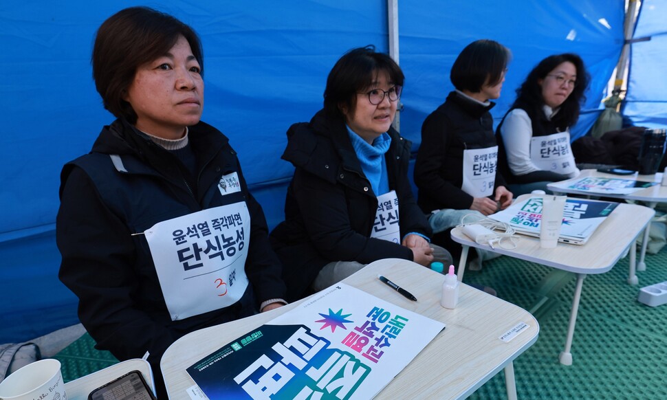 윤석열즉각퇴진·사회대개혁비상행동 의장단이 10일 오후 서울 경복궁 서십자각 인근 농성장에서 3일째 단식 농성을 하고 있다. 정용일 선임기자 yongil@hani.co.kr |