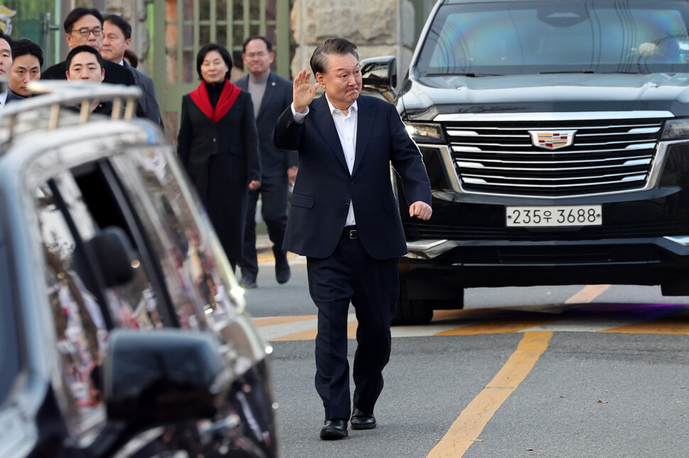 윤석열 대통령이 8일 오후 경기 의왕시 서울구치소에서 석방돼 지지자들에게 인사하며 걸어나오고 있다. 김영원 기자 forever@hani.co.kr |