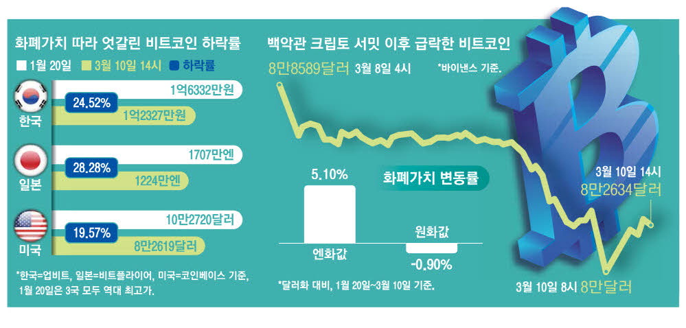 다만 비트코인의 하락률은 국가별로 차이가 크게 나타난다. 일본 최대 거래소인 비트플라이어를 기준으로 보면 비트코인은 지난 1월 20일부터 이날 오후 2시까지 1707만엔에서 1224만엔으로 28.28% 하락했다.