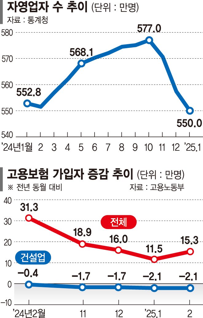이런 계절적 요인을 제외하면 지난 1월 자영업자는 작년 1월보다 2만8000명 줄었다. 이는 2021년 이후 첫 감소세다.