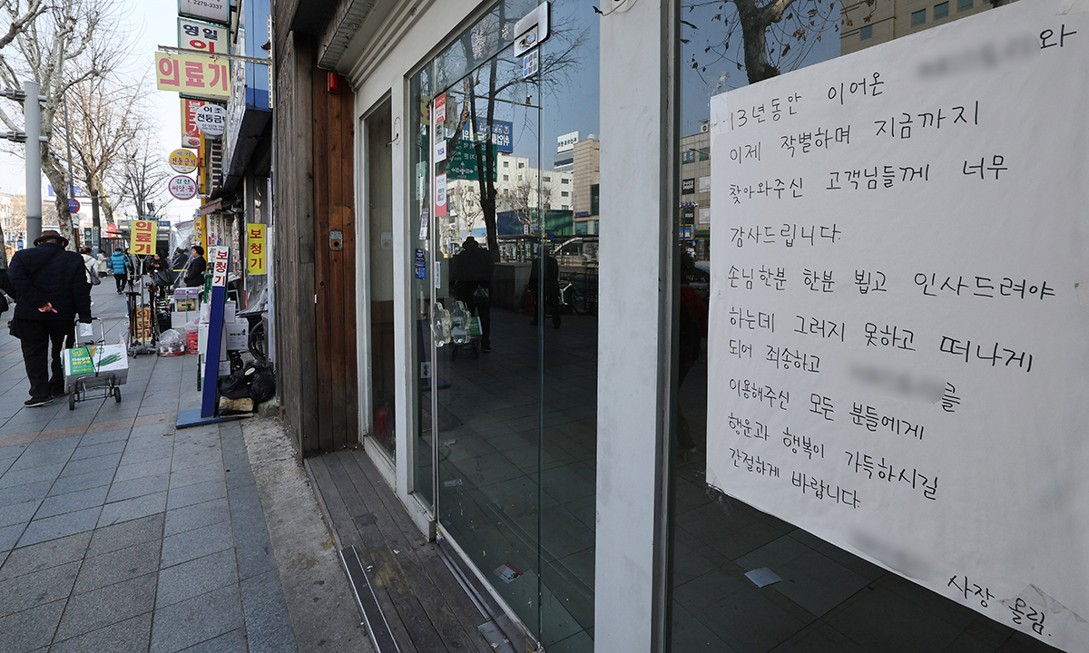 폐업 안내 10일 서울 종로구 한 카페에 ‘13년 동안 이어온 가게와 작별한다’고 적은 폐업 안내문이 걸려 있다. 남정탁 기자 |