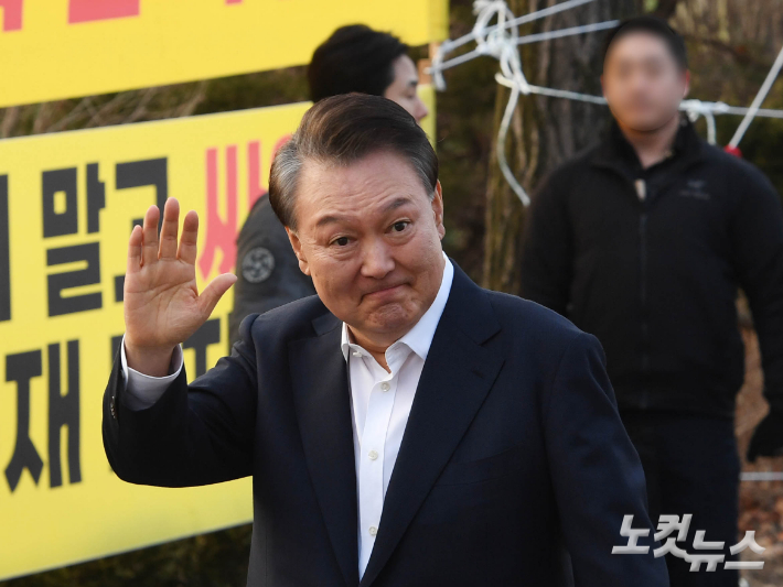 법원의 구속 취소 결정에 검찰이 항고를 포기하면서 석방된 윤석열 대통령이 지난 8일 오후 경기 의왕 서울구치소에서 나와 지지자들에게 인사를 하는 모습. 의왕=황진환 기자 |