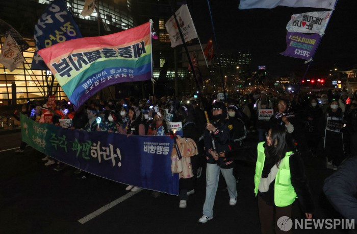 [서울=뉴스핌] 최지환 기자 = 10일 오후 서울 종로구 사직로 일대에서 윤석열 대통령 탄핵에 찬성하는 시민들이 탄핵 찬성 집회를 마치고 헌법재판소 방향으로 행진하고 있다. 2025.03.10 choipix16@newspim.com