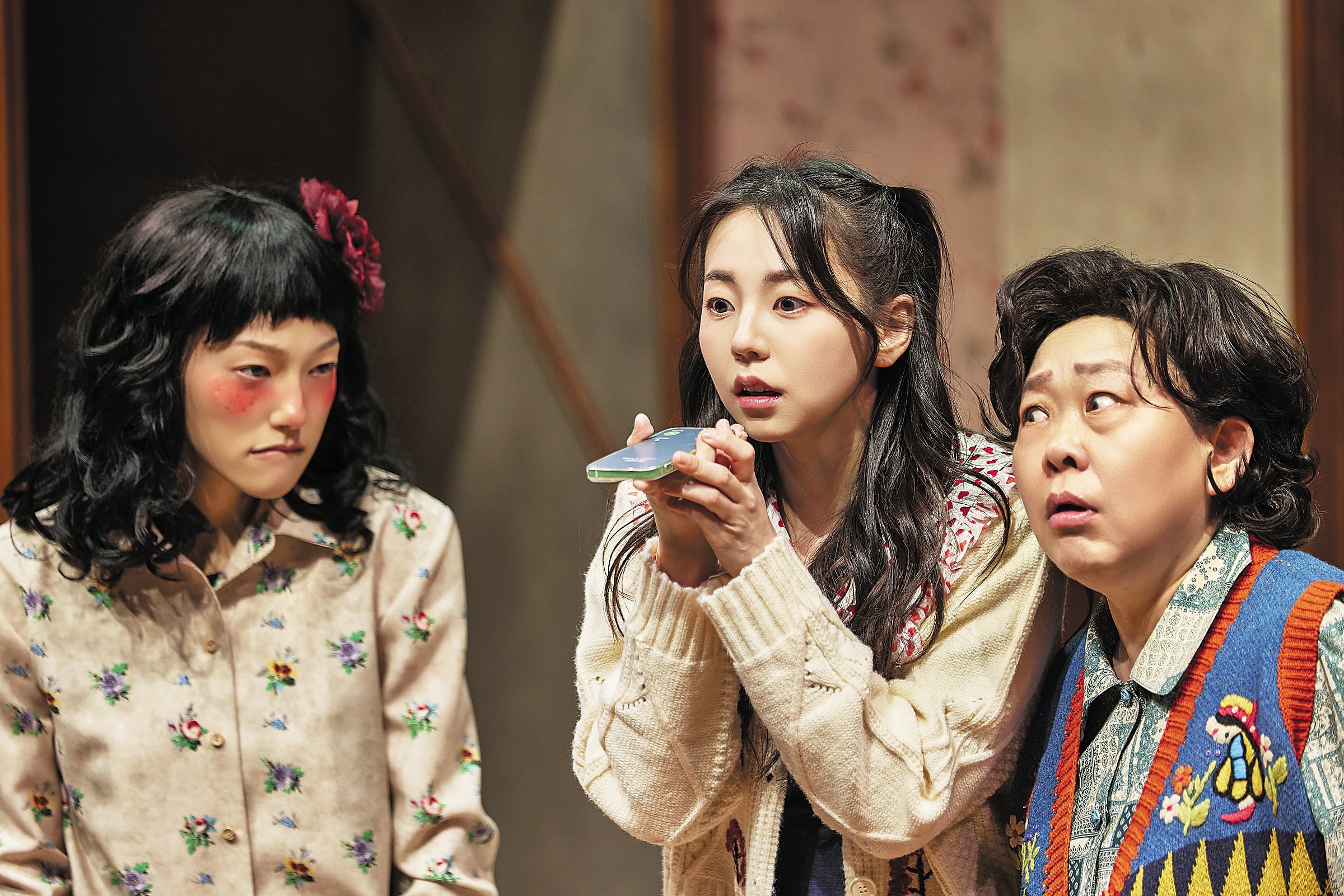 “세상에 어느 부부가 서로 전화를 하냐”는 핀잔 속에 남편의 전화를 받은 모니카(안소희·가운데)는 뜻밖의 신음 소리에 깜짝 놀란다. 왕언니 소피아(황정민·오른쪽)와 술고래 자스민(이엘)의 눈도 휘둥그레졌다. 이 의문의 전화는 여자 넷이 의기투합하는 대소동극의 시발점이 된다. /장차·파크컴퍼니 |
