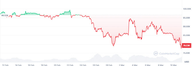 이날 가상자산 시황중계 사이트 코인마켓캡에 따르면 동부 시간 오후 5시 17분 기준 비트코인 가격은 24시간 전 대비 3.68% 하락한 7만9402.80달러를 기록 중이다. 비트코인 가격이 7만달러대로 내려앉은 것은 지난달 27일 이후 약 11일 만이다.