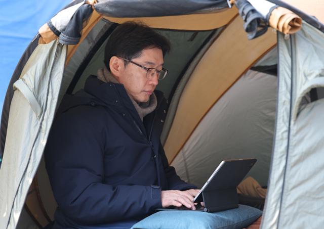 김경수 전 경남도지사가 10일 서울 종로구 경복궁역 인근에서 윤석열 대통령 파면을 촉구하는 단식 농성을 하고 있다. 뉴스1 |