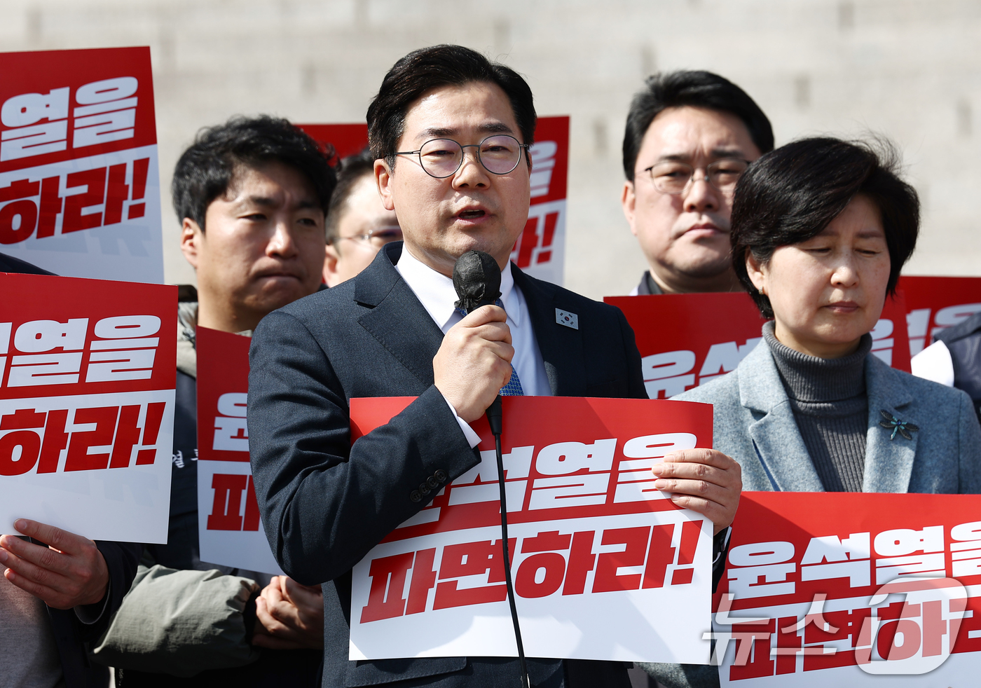 (서울=뉴스1) 김민지 기자 = 박찬대 더불어민주당 원내대표가 11일 오후 서울 여의도 국회 본청 앞에서 열린 박홍배, 김문수, 전진숙 의원의 윤석열 대통령 조기 파면 촉구 삭발식에서 격려 발언을 하고 있다. 2025.3.11/뉴스1