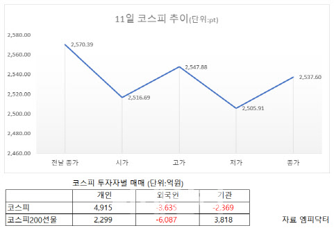 11일 엠피닥터에 따르면 코스피는 전 거래일보다 1.28%(32.79포인트) 내린 2537.60에 거래를 마쳤다. 이날 코스피는 개장과 함께 전 거래일(2570.39) 대비 2%대 급락하며 2510선에서 출발했다. 트럼프 대통령이 관세 부과 과정에서 과도기가 찾아올 수 있다고 언급하며 경기침체 가능성을 배제하지 않음을 시사하면서 미국 증시가 크게 흔들린 영향이다.