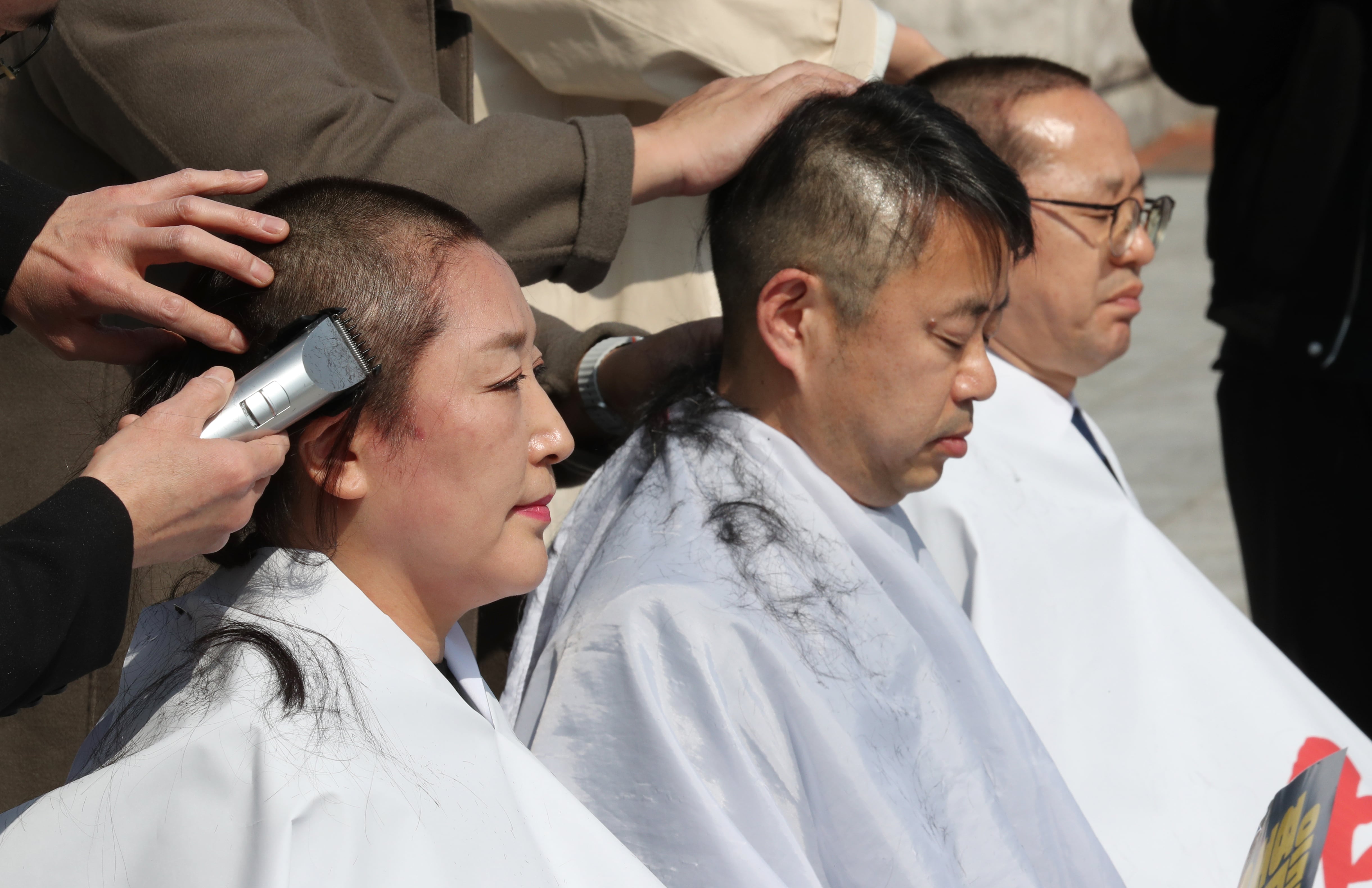더불어민주당 초선 의원들이 11일 국회 본관 앞에서 헌법재판소의 윤석열 대통령 조기 파면 결정을 촉구하며 삭발식을 하고 있다. 왼쪽부터 전진숙, 김문수, 박홍배 의원./남강호 기자 |