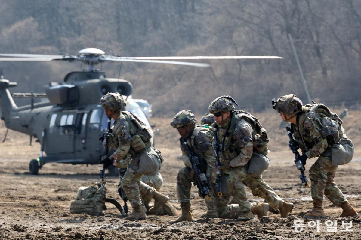 11일 경기 파주시 무건리 훈련장에서 한미 장병들이 수리온 헬기에서 내려 훈련을 하고 있다. 한미 연합훈련인 ‘자유의 방패(FS·프리덤실드)’ 일환으로 열린 이날 훈련에는 한국군 90여 명과 미군 100여 명이 참가했고 수리온 6대가 동원됐다.