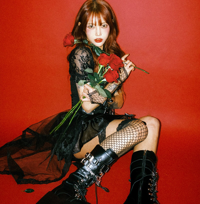 이바다의 매혹적인 눈빛과 묵직하면서도 치명적인 분위기가 눈길을 사로잡았으며, 특히 손에 쥔 붉은 장미가 극적인 색 대비를 이루며 고혹적이면서도 신비로운 아우라를 더했다.