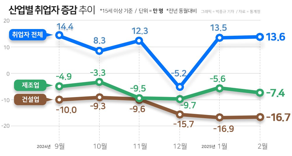 세종//아시아투데이 이정연 기자 = 지난달 취업자가 두 달 연속 10만명대 증가세를 보였지만 내수 부진에 15~29세 '쉬었음' 인구가 50만명을 처음으로 넘어서고, 제조업과 건설업 일자리도 계속된 감소세를 보이고 있다.