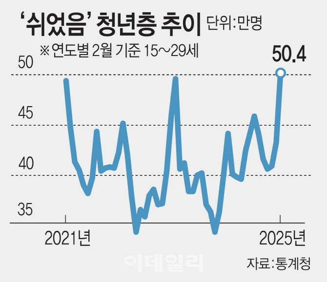 청년 실업률은 0.5%포인트 상승해 7.0%에 달했다. 2023년 3월(7.1%) 이후 처음으로 7%대 진입이다. 전체 실업률(3.2%)의 두 배가 훌쩍 넘는다. 일도 구직활동도 하지 않는 ‘쉬었음’ 청년은 50만 4000명으로, 2003년 통계 집계 이래 처음으로 50만명대를 넘어섰다.