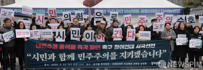 [서울=뉴스핌] 이길동 기자 = 참여연대 회원들이 12일 서울 종로구 경복궁역 인근 서십자각 앞에서 내란수괴 윤석열 파면 촉구 '참여연대 시국선언' 기자회견을 하고 있다.2025.03.12 gdlee@newspim.com