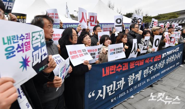 참여연대 등 시민사회단체원들이 12일 오전 서울 종로구 경복궁 서십자각 앞 단식농성장에서 내란수괴 윤석열 파면 촉구 참여연대 시국선언 기자회견을 하고 있다.