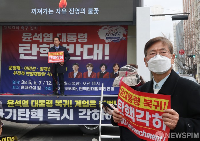 [서울=뉴스핌] 양윤모 기자 = 세이브코리아가 주최하는 윤석열 대통령 탄핵반대 범국민연합 집회가 12일 오전 헌법재판소 인근 현대건설 앞에서 개최되고 있다. 2025.03.12 yym58@newspim.com
