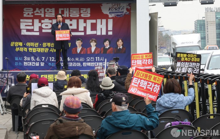 [서울=뉴스핌] 양윤모 기자 = 세이브코리아가 주최하는 윤석열 대통령 탄핵반대 범국민연합 집회가 12일 오전 헌법재판소 인근 현대건설 앞에서 개최되고 있다. 2025.03.12 yym58@newspim.com