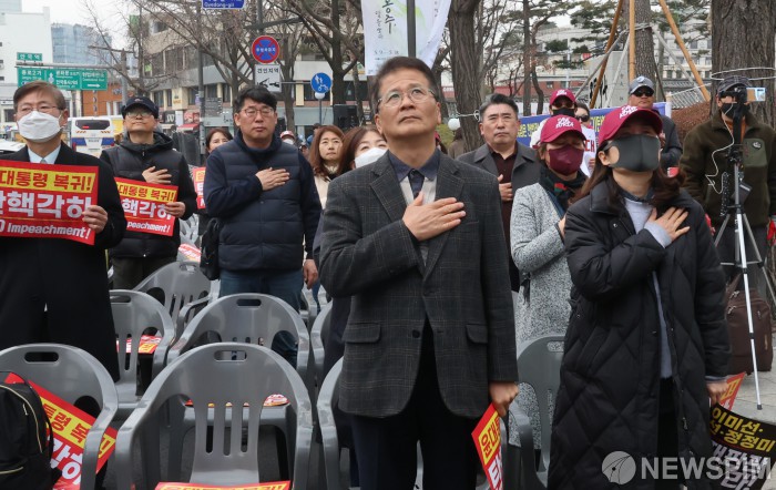 [서울=뉴스핌] 양윤모 기자 = 세이브코리아가 주최하는 윤석열 대통령 탄핵반대 범국민연합 집회가 12일 오전 헌법재판소 인근 현대건설 앞에서 개최되고 있는 가운데 참석자들이 국민의례를 하고 있다. 2025.03.12 yym58@newspim.com
