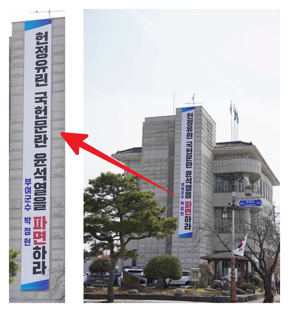한겨레 취재 결과, 박정현 군수는 지난 7일 부여읍 동남리 부여군여성문화회관에 ‘헌정유린 국헌문란 윤석열을 파면하라’는 세로형 펼침막을 내걸었다. 부여군수 박정현 이름으로 게시한 이 펼침막은 가로 1.5m, 세로 14m 크기로, 흰색 바탕에 고딕체로 제작됐으며 ‘파면’ 글자를 빨간색으로 강조했다.