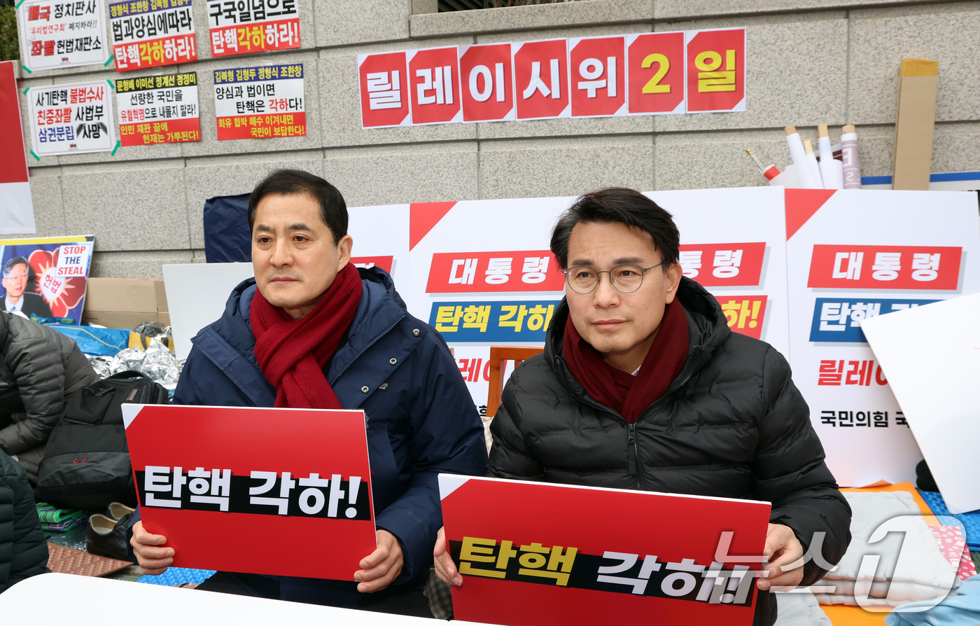 (서울=뉴스1) 김명섭 기자 = 박대출·윤상현 국민의힘 국회의원이 12일 오후 서울 종로구 헌법재판소 앞에서 윤석열 대통령 탄핵 각하 촉구 릴레이 시위를 하고 있다. 2025.3.12/뉴스1
