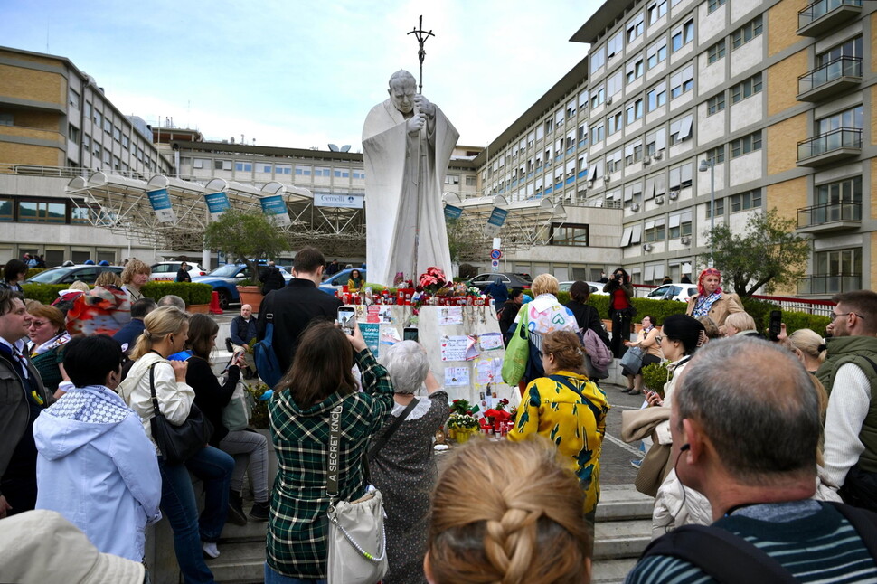프란치스코 교황이 입원 중인 이탈리아 로마 제멜리 병원 입구에 위치한 요한 바오로 2세 동상 옆에 신자들이 11일 모여 있다. EPA 연합뉴스 |