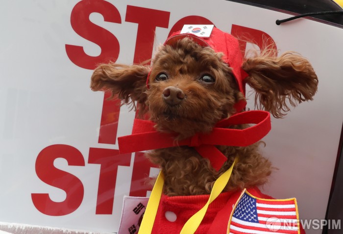 [서울=뉴스핌] 양윤모 기자 = 윤석열 대통령 탄핵심판 선고를 앞두고 12일 오후 서울 종로구 헌법재판소 앞에서 애완견이 집회에 참석하고 있다. 2025.03.12 yym58@newspim.com