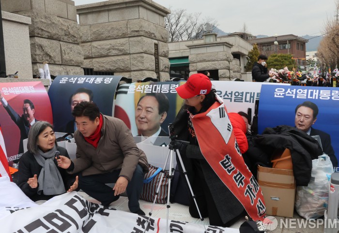 [서울=뉴스핌] 양윤모 기자 = 윤석열 대통령 탄핵심판 선고를 앞두고 12일 오후 서울 종로구 헌법재판소 앞에서 윤 대통령 지지자들이 릴레이 시위를 하고 있다. 2025.03.12 yym58@newspim.com